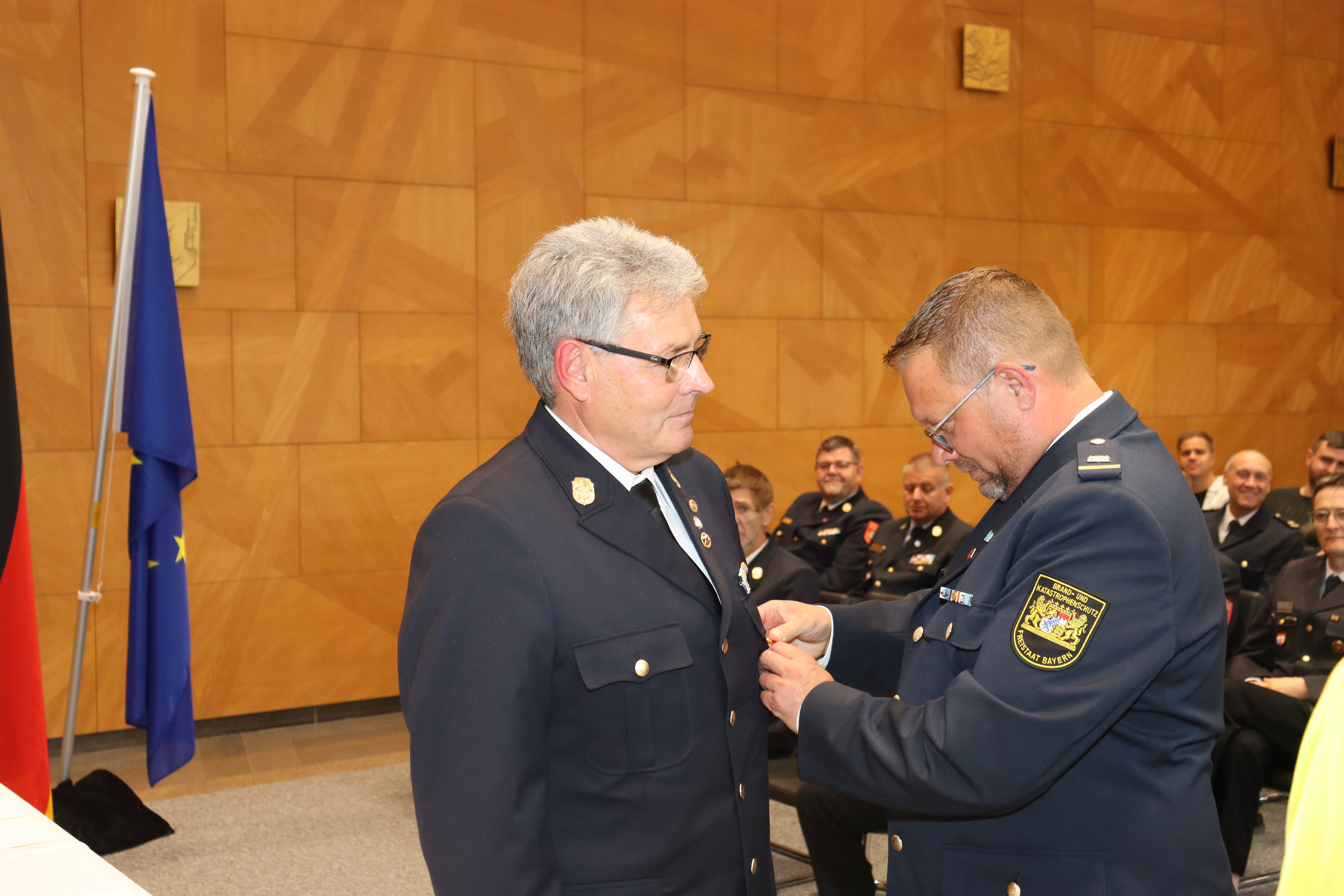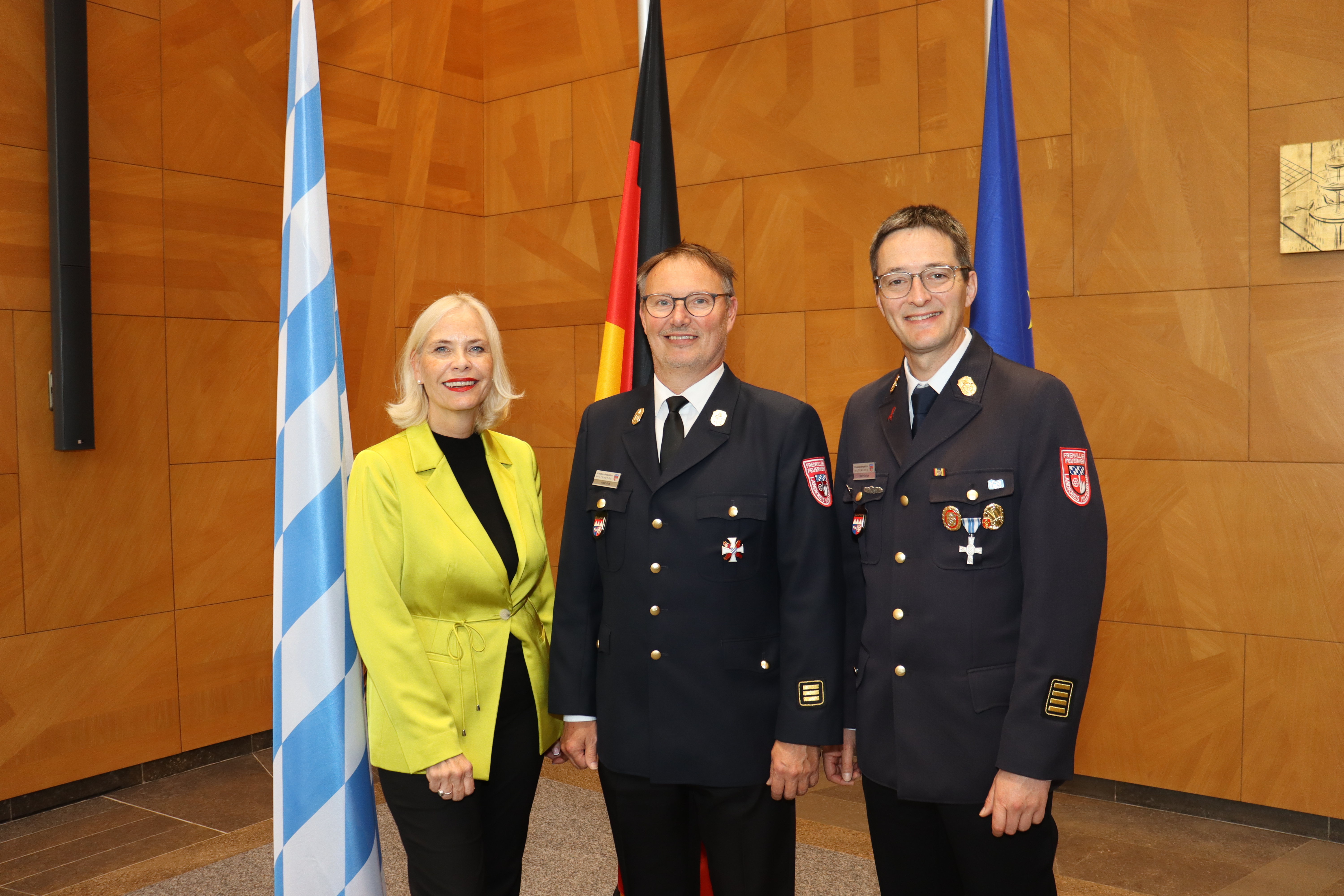 Regierungspräsident Dr. Eugen Ehmann händigte das Steckkreuz für besondere Verdienste um das Feuerwehrwesen an Brandmeister Walter Emmert, Hammelburg, und Kreisbrandrat Stefan Schmöger, Bad Neustadt a.d.Saale, aus.