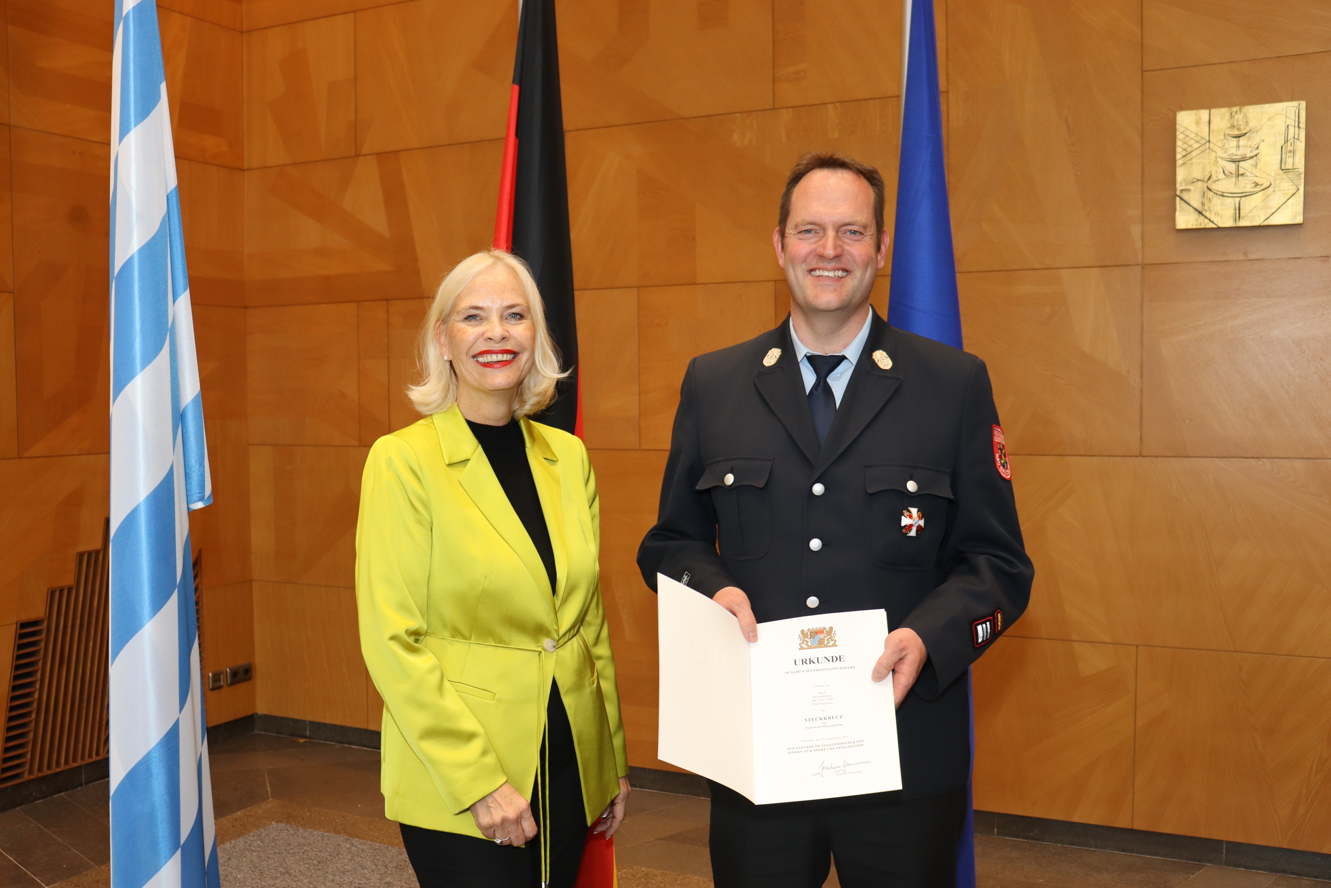 Regierungspräsidentin Dr. Susanne Weizendörfer händigte am 1. Oktober 2025 in der Regierung von Unterfranken das Steckkreuz für besondere Verdienste um das Technische Hilfswerk an Andre Stark aus Hausen, Landkreis Miltenberg, aus.