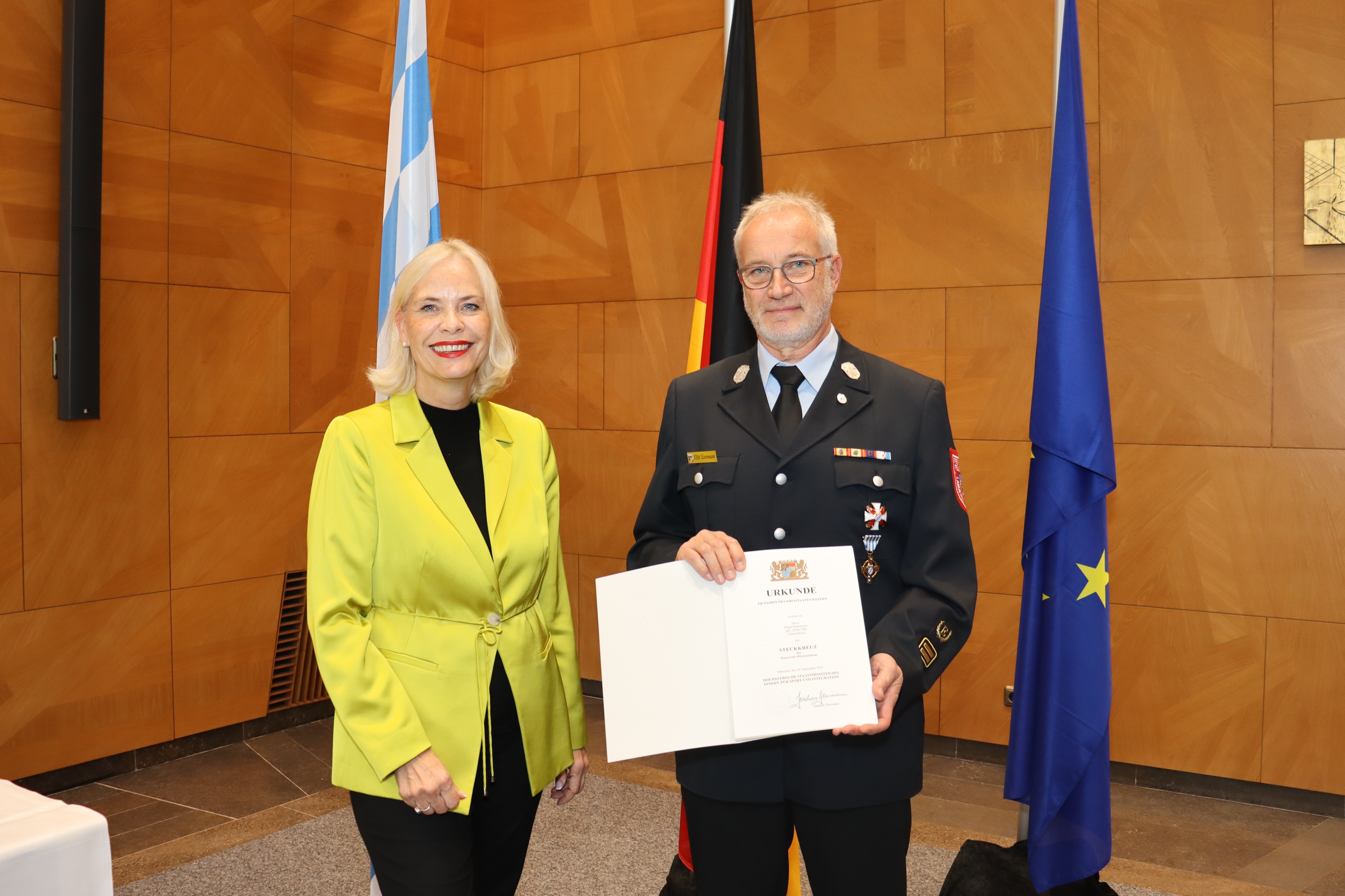 Bildunterschrift 3: Regierungspräsidentin Dr. Susanne Weizendörfer (links) überreicht das Steckkreuz für besondere Verdienste um das Feuerwehrwesen an Thomas Graumann (rechts).