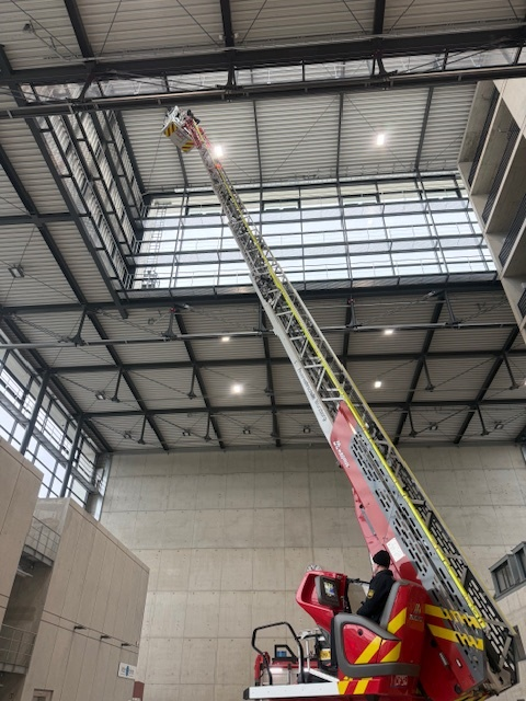 Bildunterschrift: Die 30 Meter hohe Drehleiter in der Übungshalle der Feuerwehrschule Würzburg