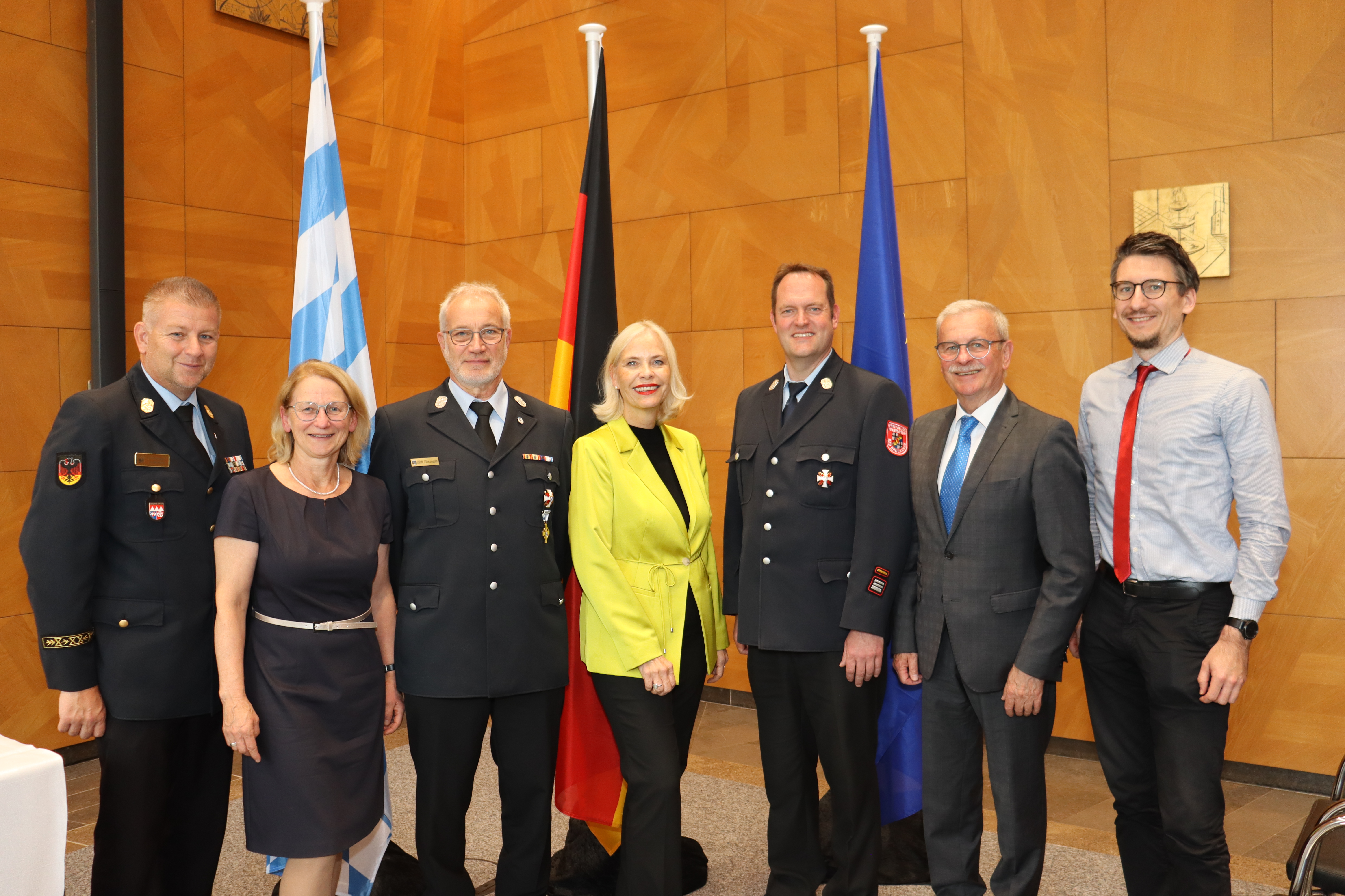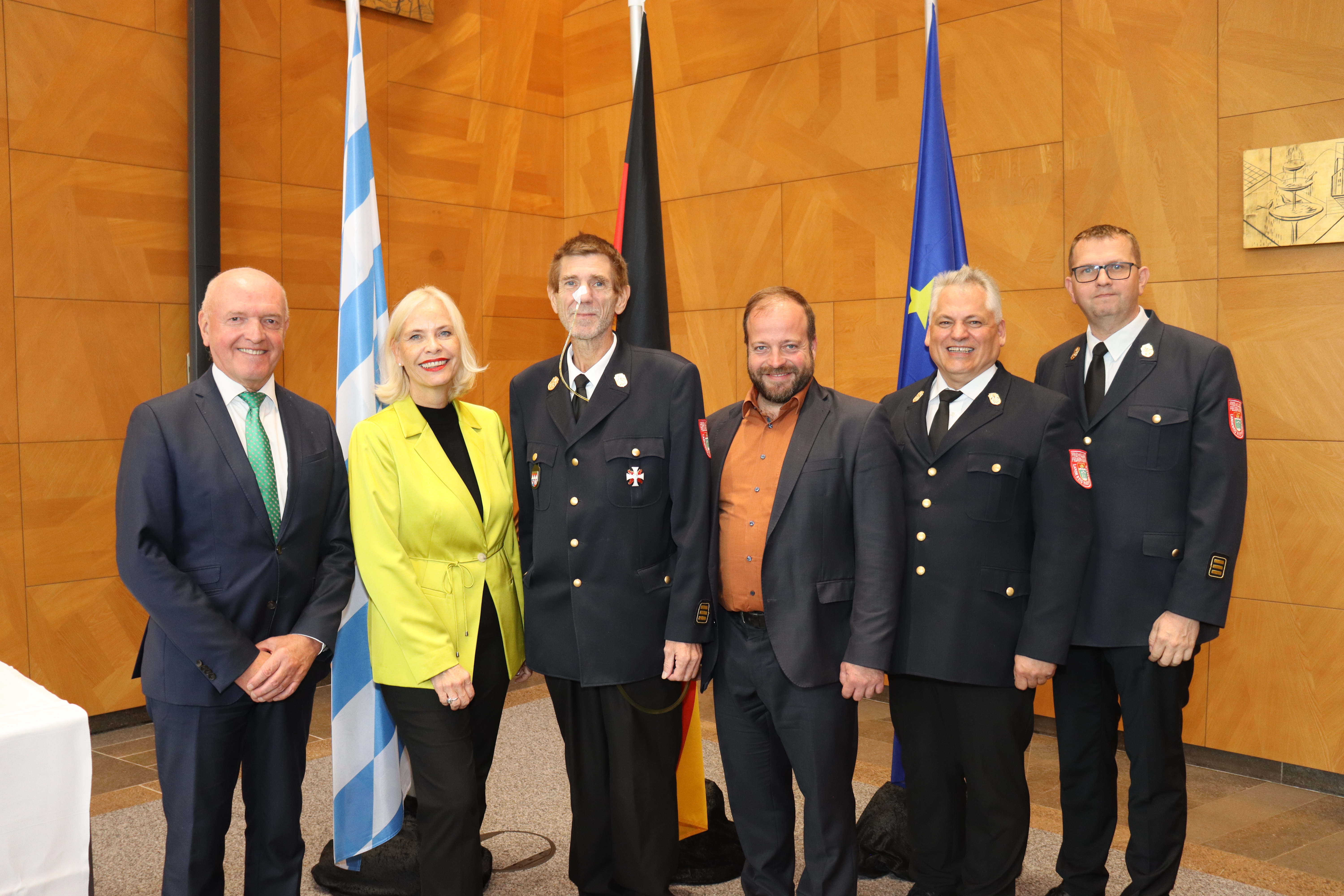 Staatssekretär Sandro Kirchner und Regierungspräsident Dr. Eugen Ehmann händigten das Steckkreuz für besondere Verdienste um das Feuerwehrwesen an Thomas Eyrich, Ronald Geis, Thomas Habermann, Christian Neugebauer und Karl-Heinz Thiemer aus.
