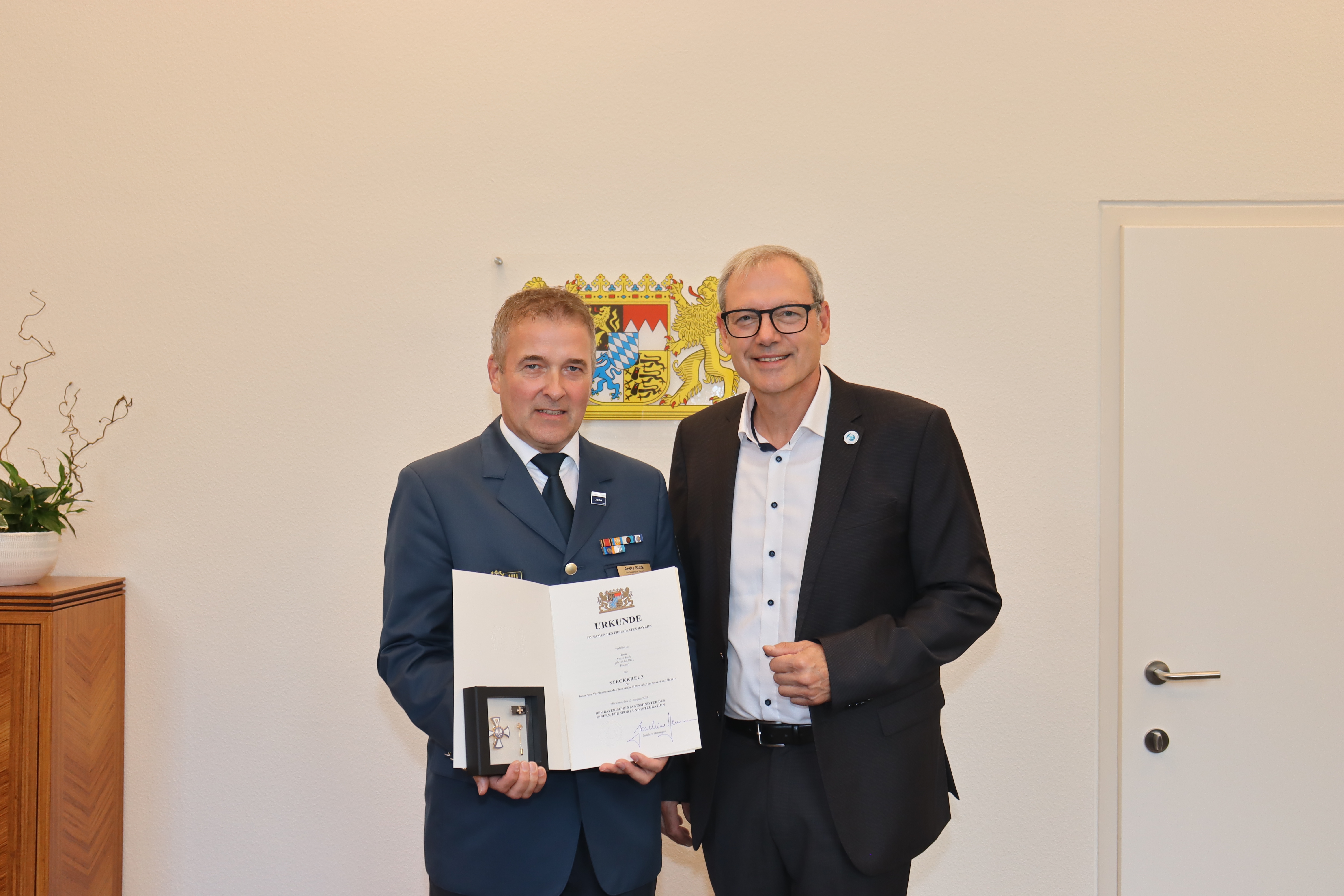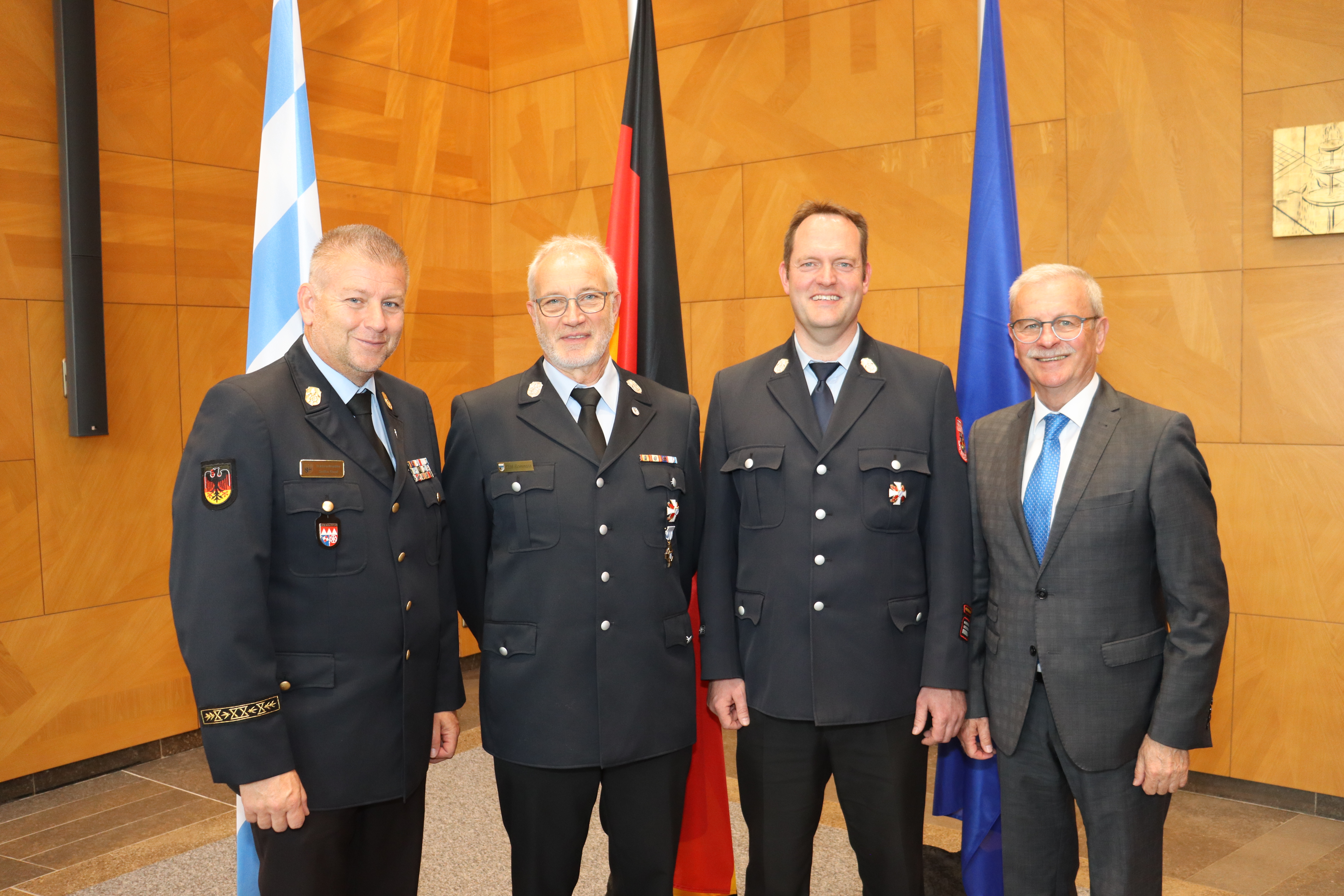 Regierungspräsident Dr. Eugen Ehmann händigte das Steckkreuz für besondere Verdienste um das Feuerwehrwesen an Brandmeister Walter Emmert, Hammelburg, und Kreisbrandrat Stefan Schmöger, Bad Neustadt a.d.Saale, aus.