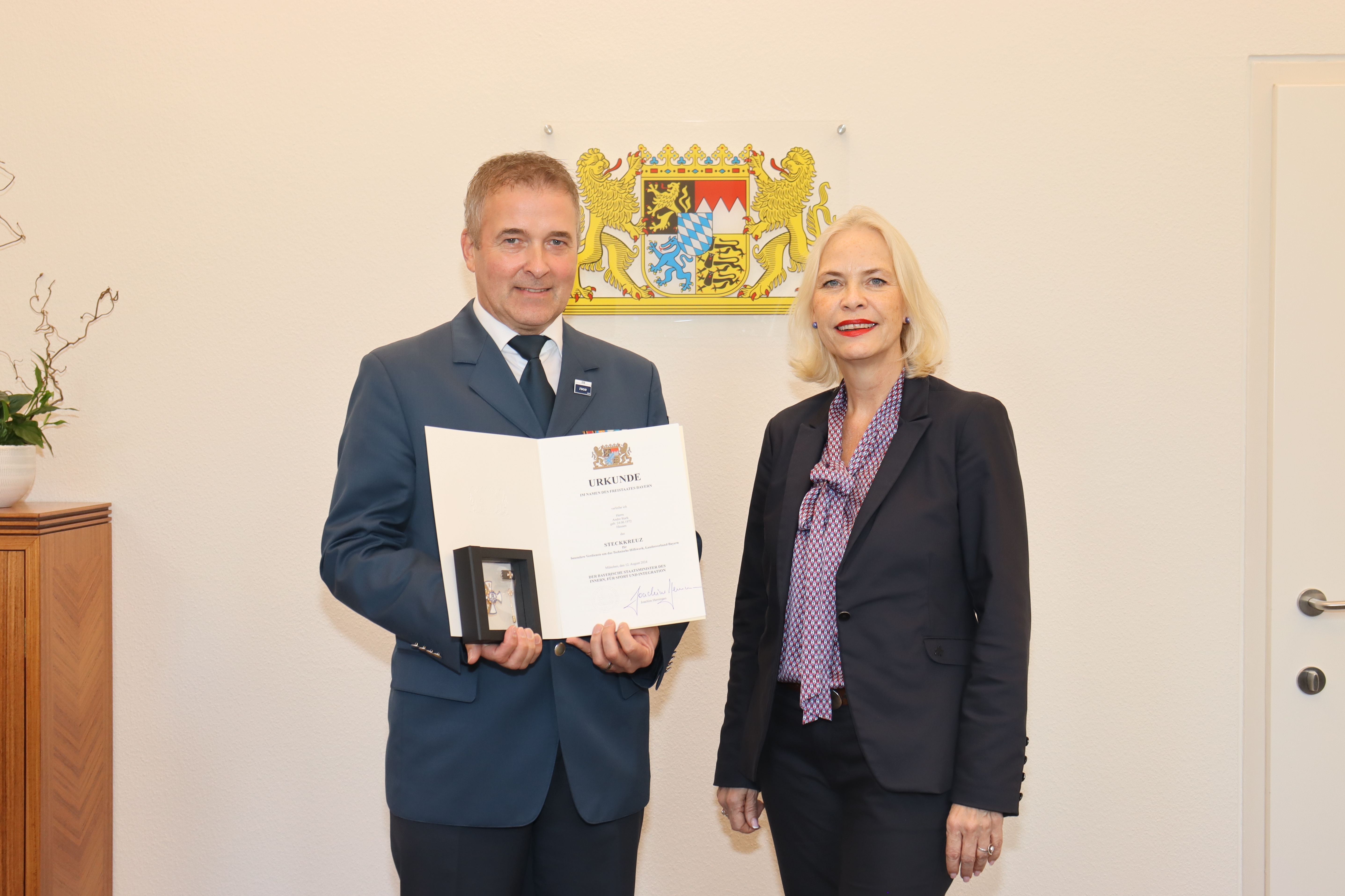 Regierungspräsidentin Dr. Susanne Weizendörfer händigte am 1. Oktober 2025 in der Regierung von Unterfranken das Steckkreuz für besondere Verdienste um das Technische Hilfswerk an Andre Stark aus Hausen, Landkreis Miltenberg, aus.