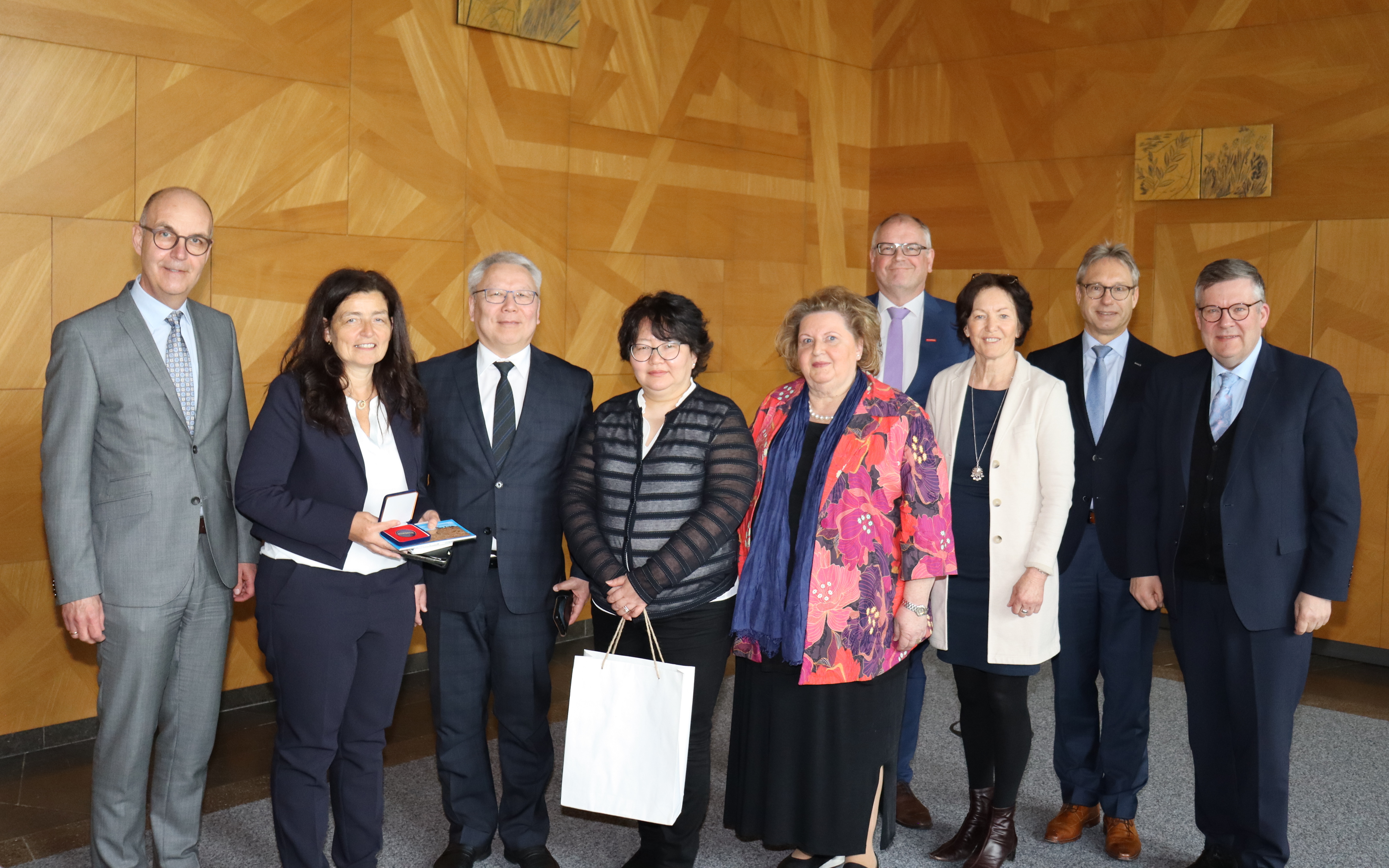 Bildunterschrift: Der Botschafter der Mongolei zu Gast bei der Regierung von Unterfranken (v.l.n.r.): Regierungsvizepräsident Jochen Lange, stv. Landrätin Christine Haupt-Kreutzer (Landkreis Würzburg), Botschafter Dr. Birvaa Mandakhbileg mit Ehefrau Enkhburd Jugder, Eva Maria Linsenbreder (stv. Bezirkstagspräsidentin), Ludwig Paul (HWK), Christine Bender (stv. Landrätin Schweinfurt), Jürgen Bode (IHK) und Volkmar Halbleib (MdL).