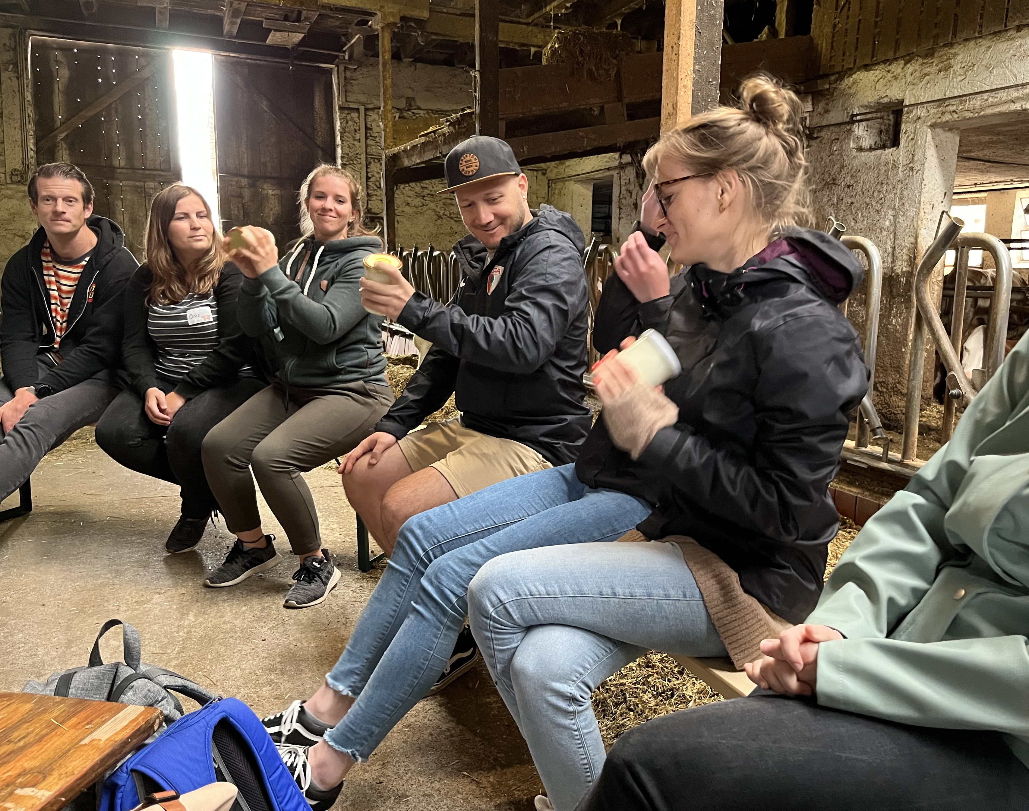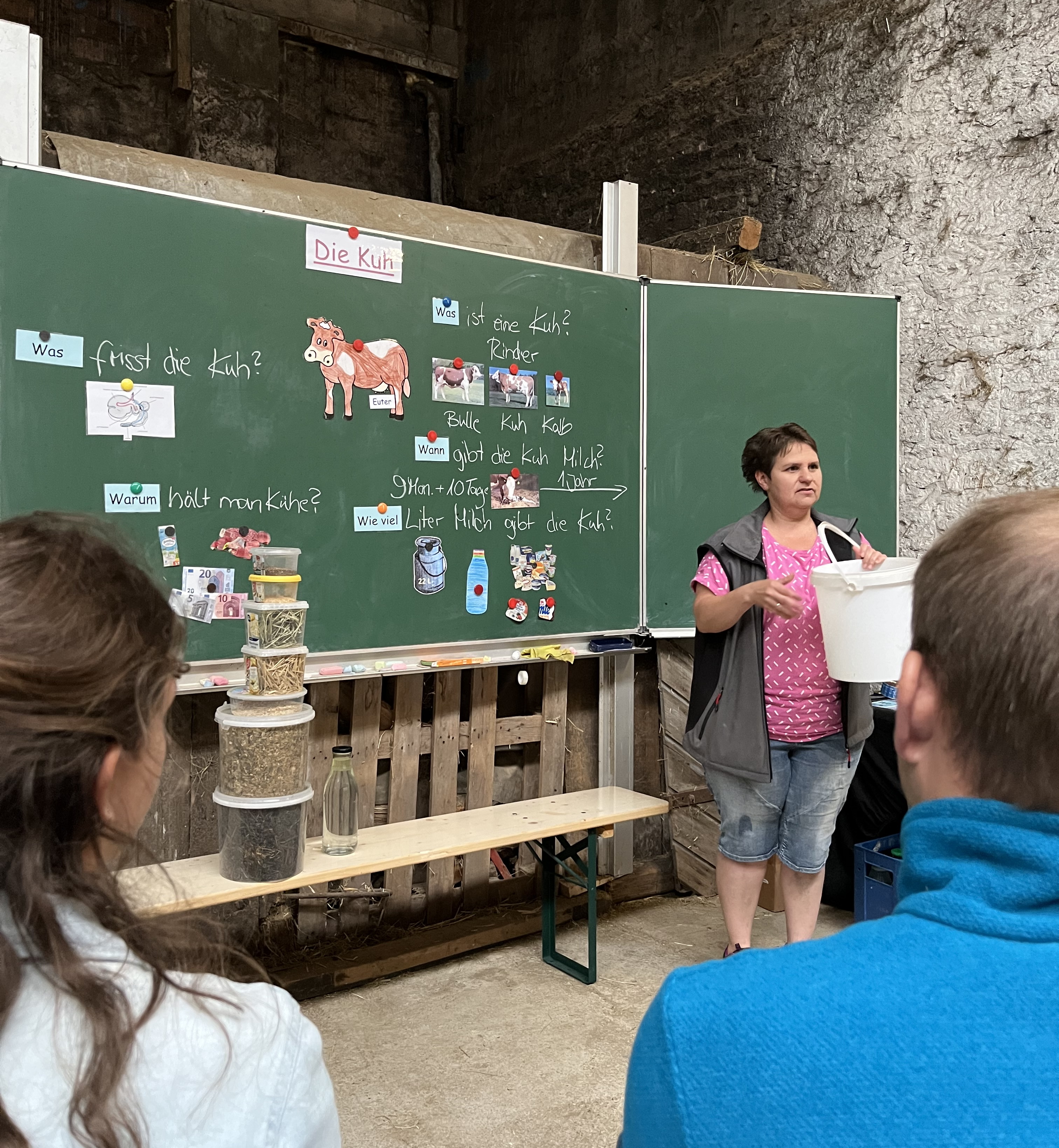 Mit der Sonderaktion eines Seminartages „Erlebnis Bauernhof“ für Referendarinnen und Referendare für Förderschulen wurden die Aktivwochen eröffnet. Den angehenden Lehrkräften wurden zunächst am AELF Kitzingen-Würzburg verschiedene Programme von „Alltagskompetenz – Schule fürs Leben“ vorgestellt. Dazu gehört beispielsweise das Angebot für Grund- und Mittelschüler „Auf die Sinne fertig los!“ oder im Bereich Konsumwelt „Immer gut bei Kasse“. Das Programm „Ernährung macht Schule – Ernährungshandwerk erleben“ zielt auf 7. bis 9. Klassen ab. Nach einer kurzen Pause fuhr man dann auf den Milchviehbetrieb Hopfengart in Kleinlangheim. Dort erklärte Maria Wallrapp-Hopfengart den Referendarinnen und Referendaren alles rund um die Kuh – ganz nach dem Schema wie es die Schülerinnen und Schüler von ihr erfahren. Ganz erstaunt hat alle Teilnehmenden, dass im Kuhstall sogar eine richtige Schultafel installiert ist. Es wurden Fragen geklärt, was beispielsweise eine Kuh frisst, wie lange sie Milch geben kann oder warum manche Kühe Nasenringe tragen. Nach einer gemeinsamen Verkostung von handgeschüttelter Butter auf frischem Brot wurde im Anschluss noch der Kälberstall, die Melkanlage und der Milchtank begutachtet und erklärt. Ein ganz besonderes Highlight auf dem Betrieb Hopfengart war die Kuh Klara: Sie hat ein Herz in ihrem Fell. Die Referendarinnen und Referendare haben diesen Praxistag sichtlich genossen und werden ihre zukünftigen Schülerinnen und Schüler für die Programme der ÄELF begeistern.
