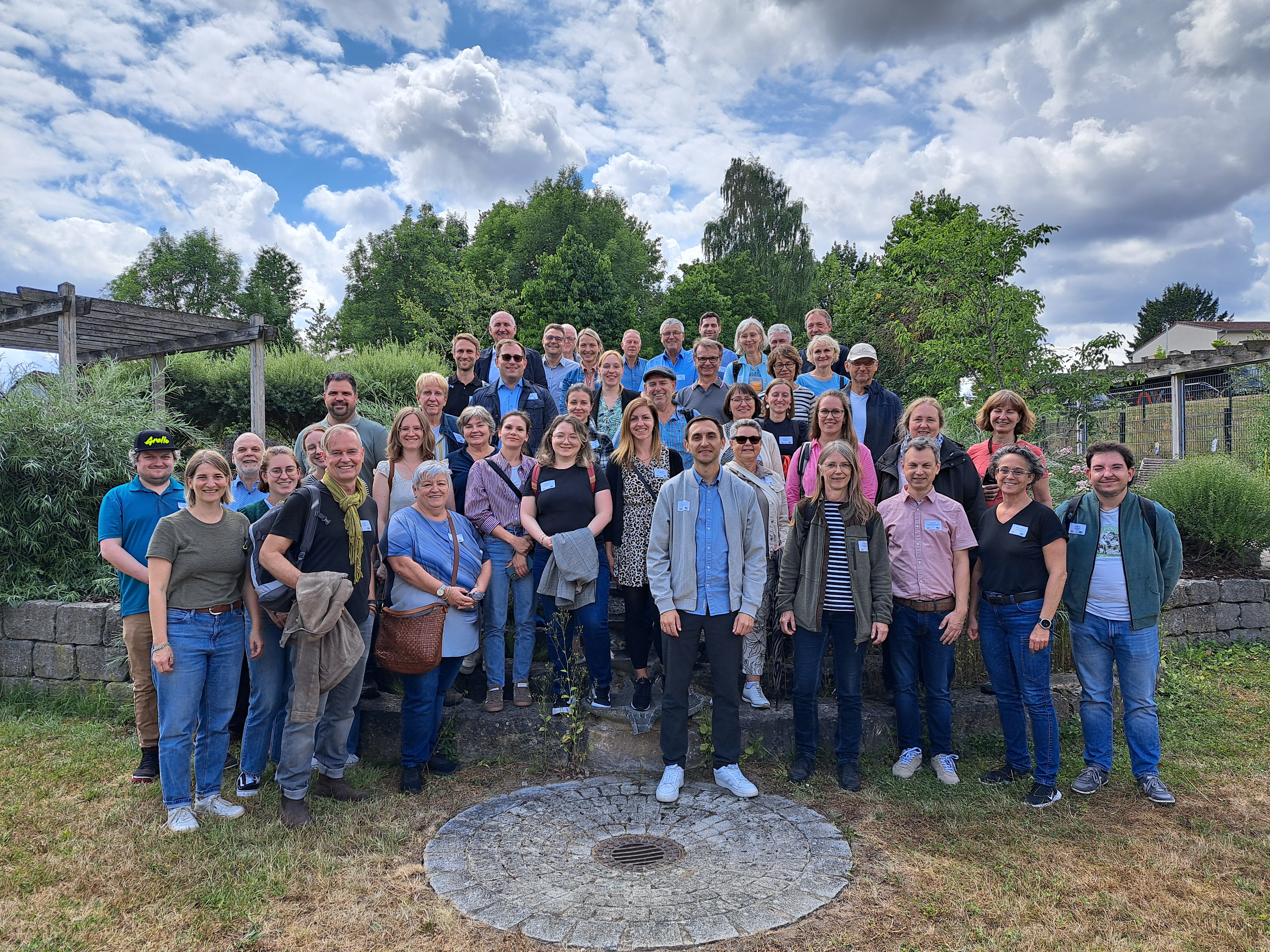 Würzburg (ruf) – Wie können Bauen im Bestand und nachhaltige Gemeindeentwicklung auch im ländlichen Raum funktionieren? Wie gestaltet man verdichtetes Wohnen dorfgerecht? Auf diese Fragen bot eine ganztägige Busexkursion der Flächensparoffensive an der Regierung von Unterfranken Antworten. Am 8. Juli machten sich knapp 50 Interessierte aus ganz Unterfranken auf den Weg in den Landkreis Neustadt a.d.Aisch-Bad Windsheim. Dort setzen die Kommunen Langenfeld, Uehlfeld und Burghaslach auf innovative Projekte, um ihre Gemeinden lebendig und zukunftsfähig aufzubauen. Die Exkursionsgruppe, bestehend aus Bürgermeistern, Gemeinderäten und weiteren regionalen Akteuren, erfuhr hier, wie mit Mut und Gemeinschaftssinn gelungene Innenentwicklung umgesetzt wird. Dadurch können Freiflächen am Ortsrand unbebaut bleiben für Hochwasserschutz und Landwirtschaft.