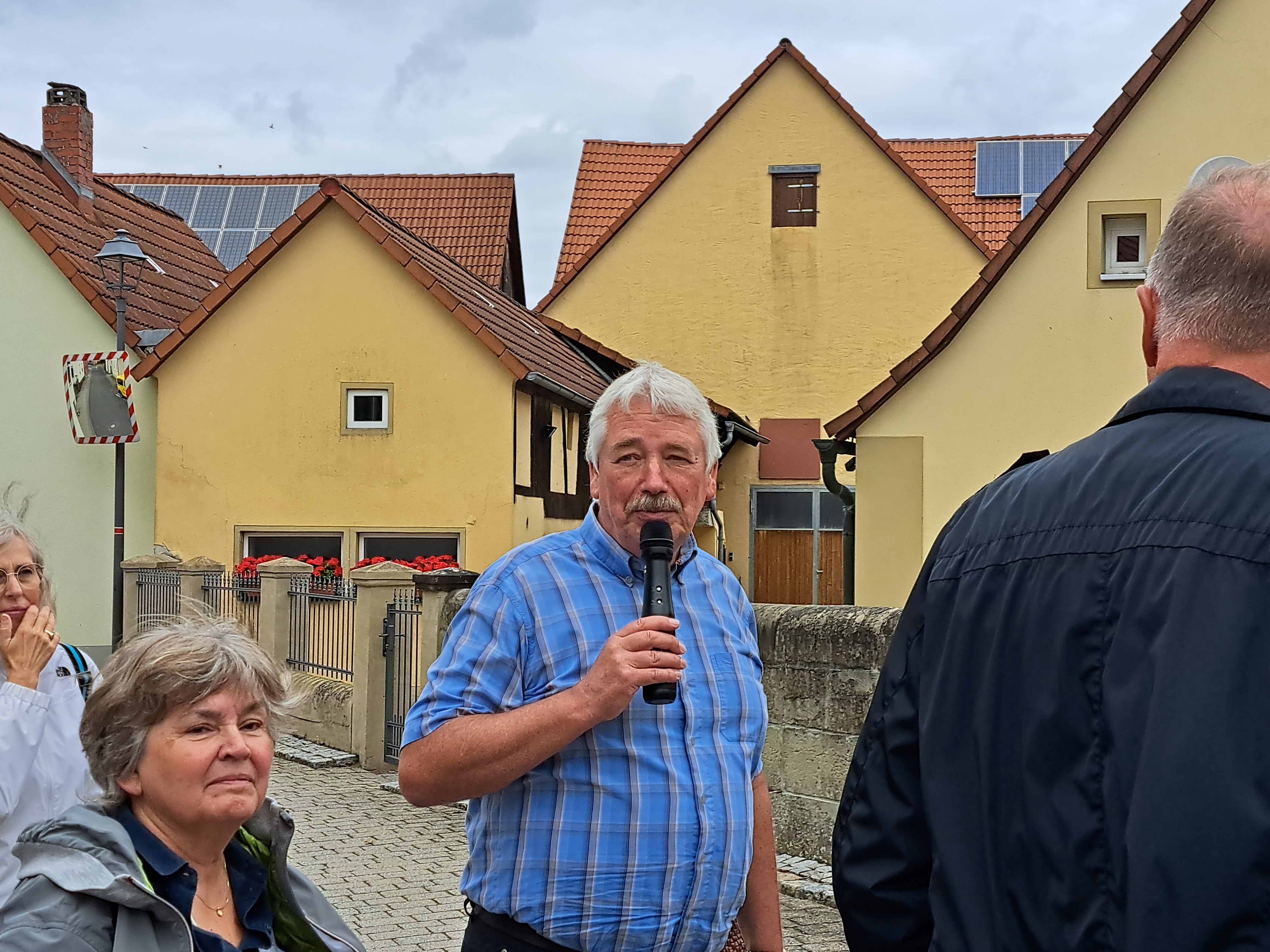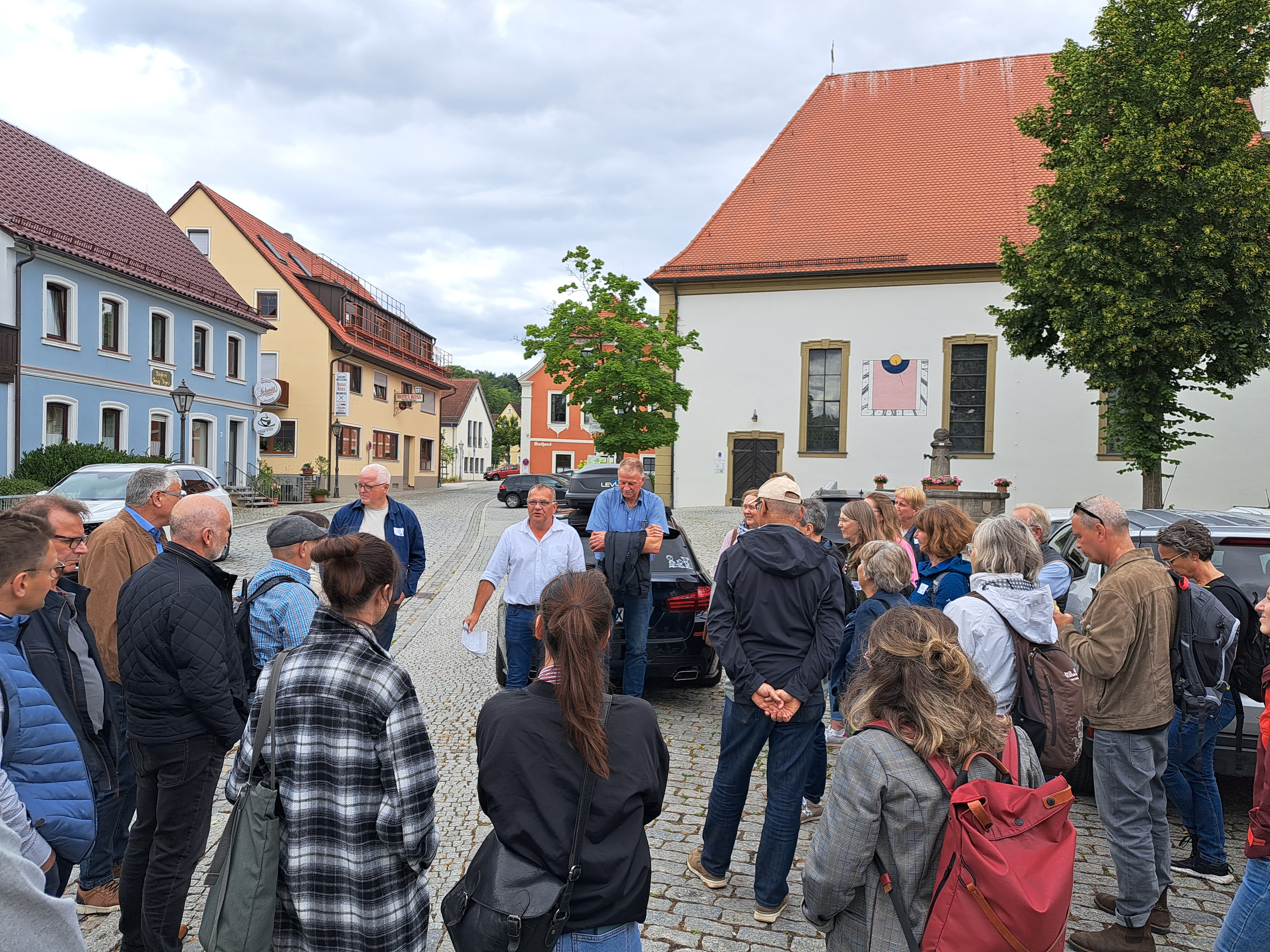 Bild 3 (Foto: Anne Weiß / Regierung von Unterfranken): Am Kirchplatz in Burghaslach: Start des Ortsrundganges mit Bürgermeister Armin Luther.